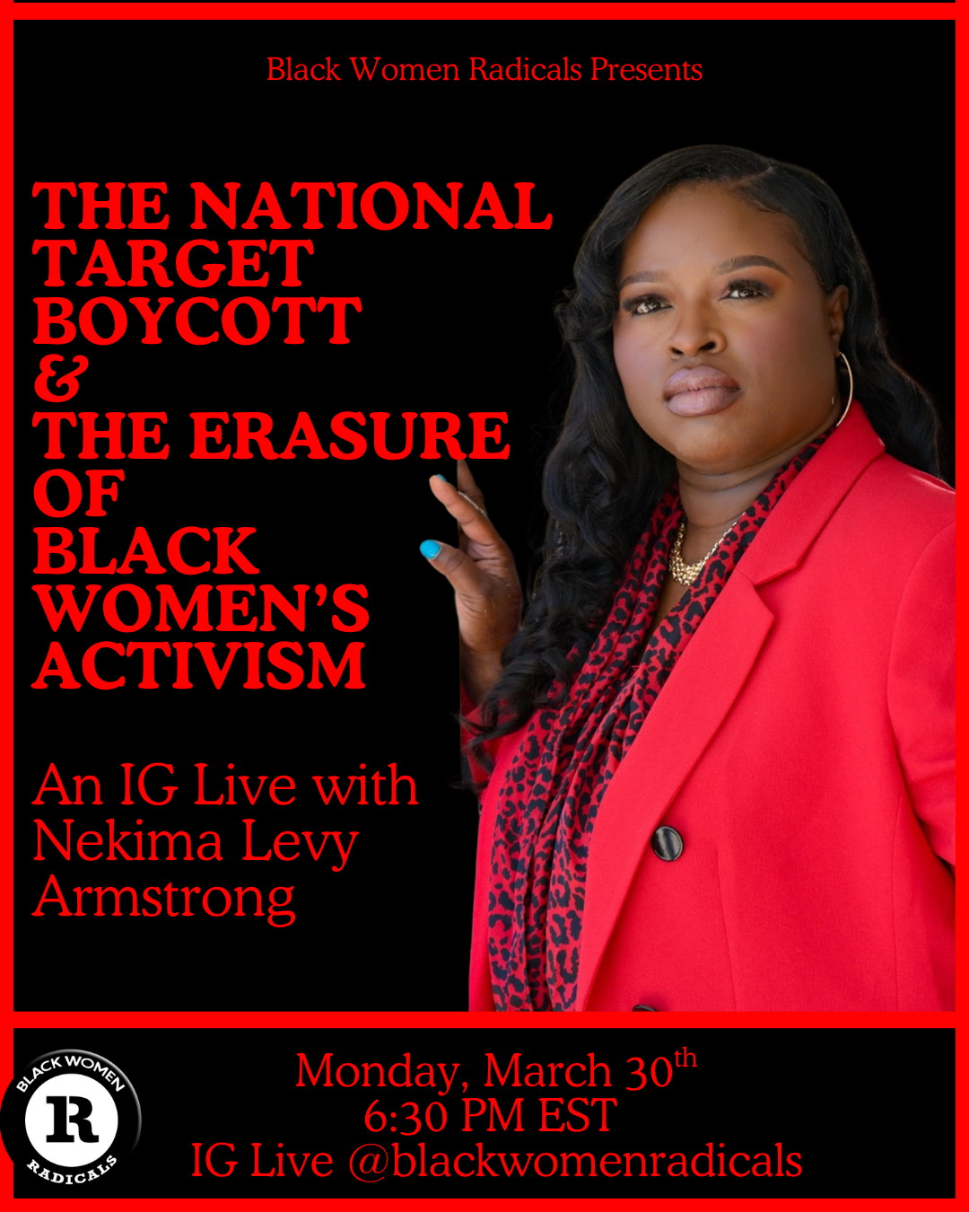 On Monday, March 30 at 6:30 PM EST, join us for an IG Live (@blackwomenradicals) with Nekima Levy Armstrong, a Minneapolis-based civil rights attorney and co-founder of the National Target Boycott.